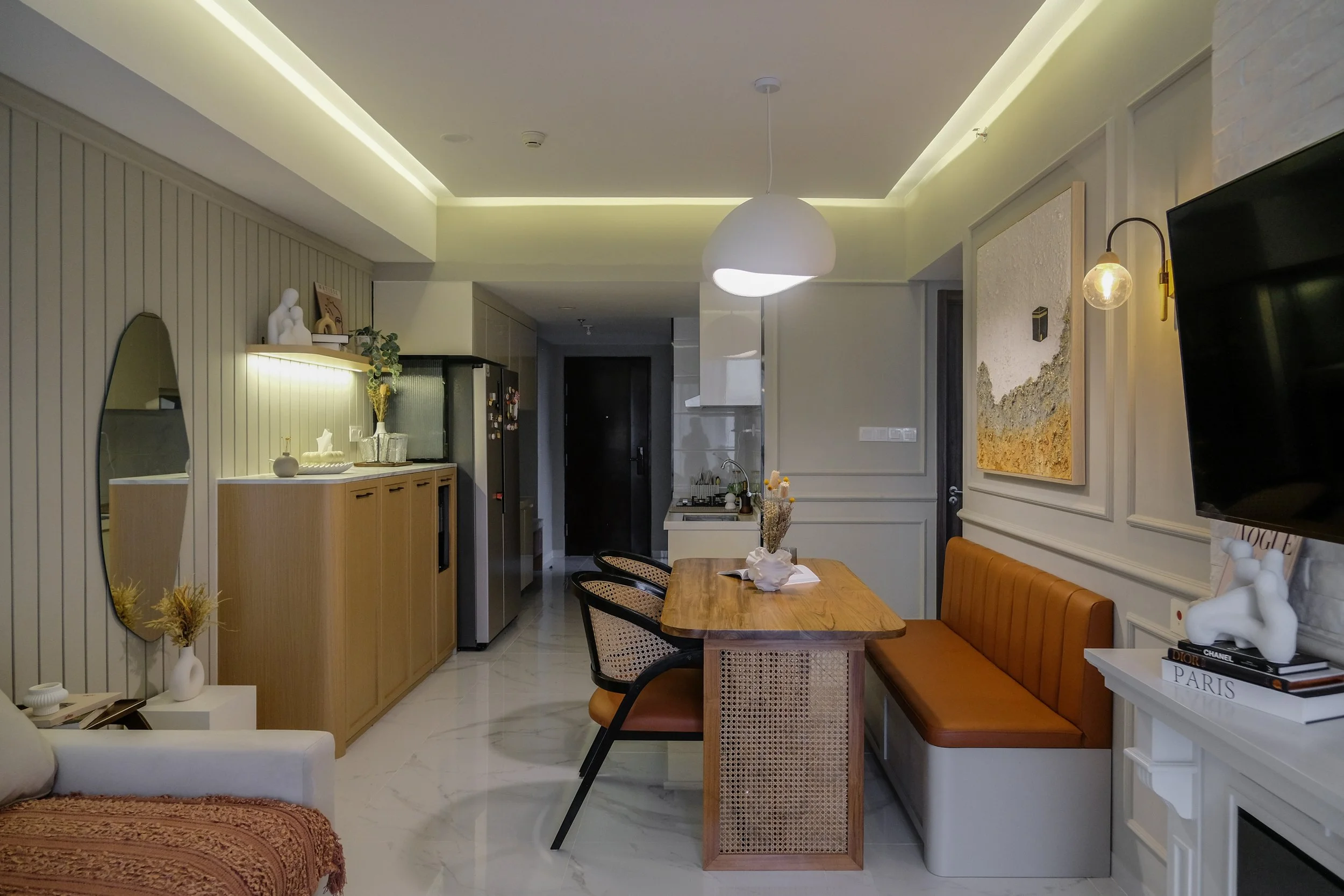 Throughout the apartment, the design language remains intentionally simple. Classic wall mouldings are paired with warm wood tones and rattan accents, adding depth and tactility without overpowering the space. The result is a calm, cohesive interior where classic references are gently woven into a contemporary framework, an understated yet expressive home that feels timeless, functional, and quietly refined.