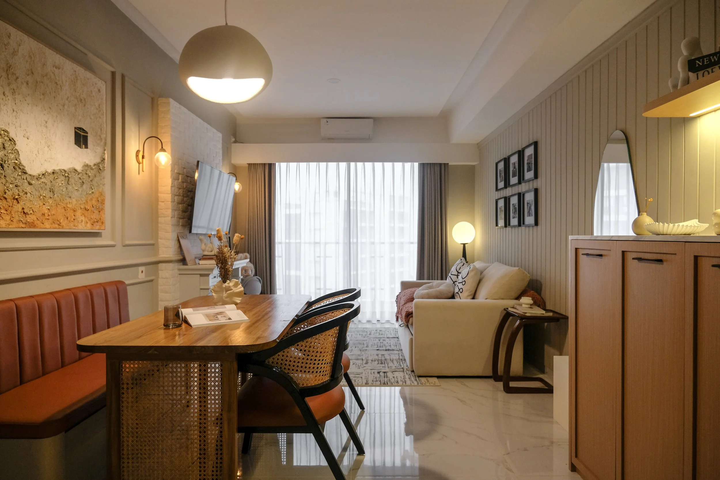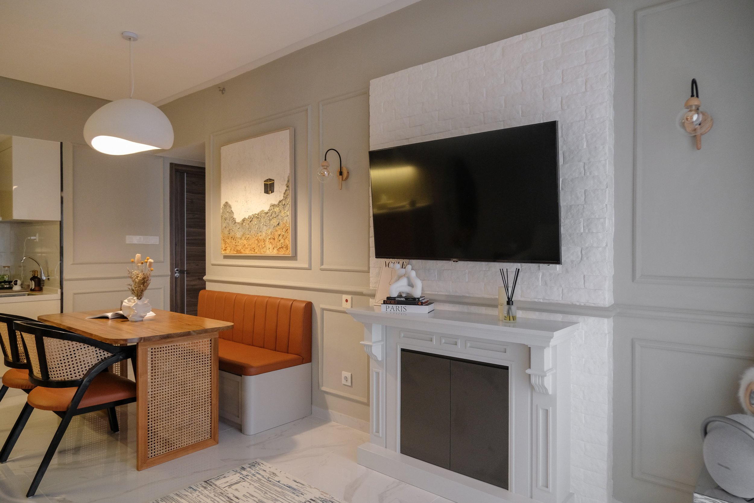 A bespoke storage unit, designed to mimic the proportions of a traditional fireplace, becomes the focal point of the apartment. Clad in subtle brick paneling, it introduces texture and architectural character while serving a practical purpose, anchoring the living area without excess ornamentation. The fireplace-inspired form lends a sense of heritage, reinterpreted through clean lines and restrained finishes.
