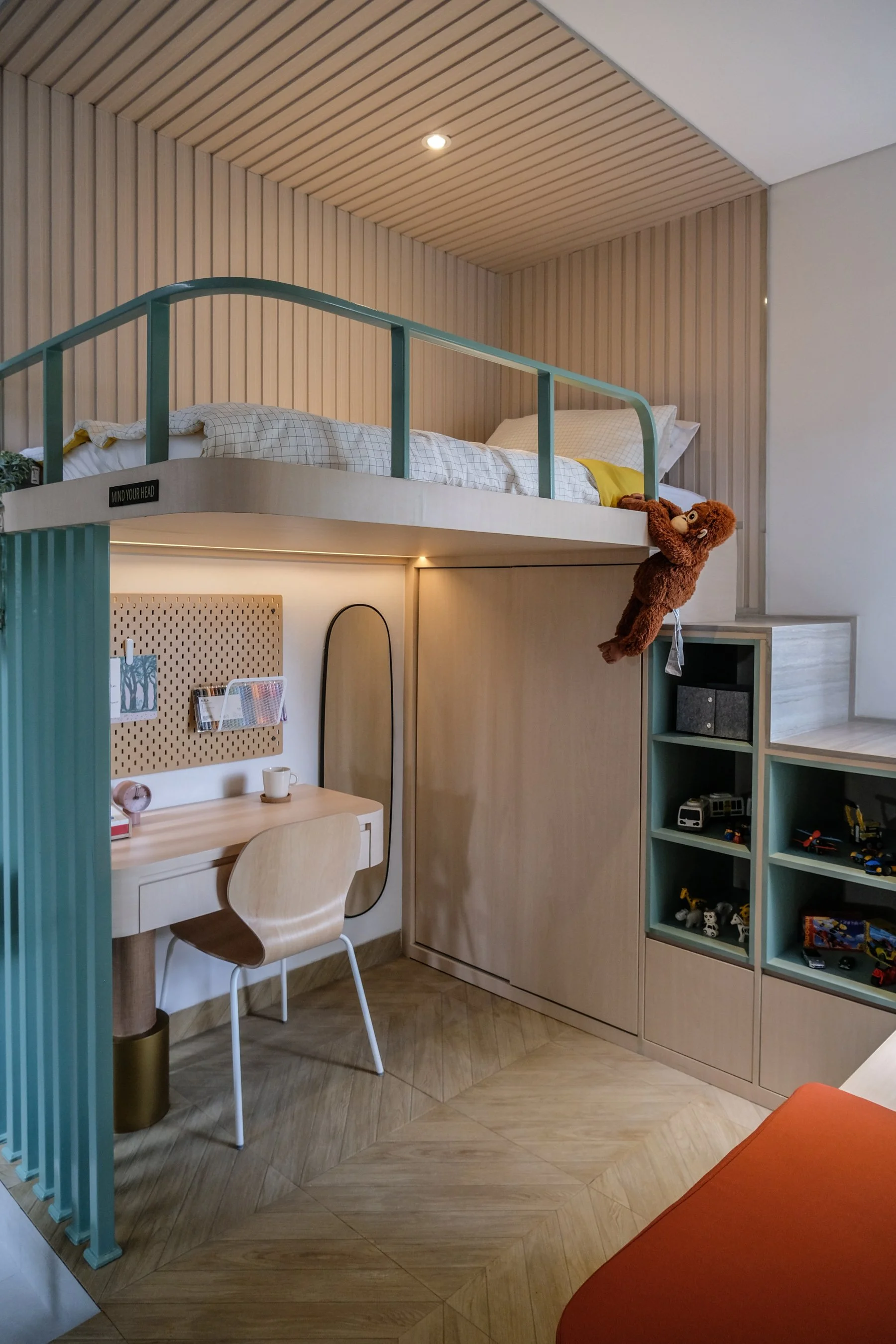 At the heart of the home, the staircase becomes more than circulation. Integrated storage beneath maximises every square metre, while its sculpted form doubles as a TV backdrop, anchoring the living area with quiet architectural presence. Soft whites, pale greys, and warm wood tones define a minimalist modern language, balancing functionality with warmth.