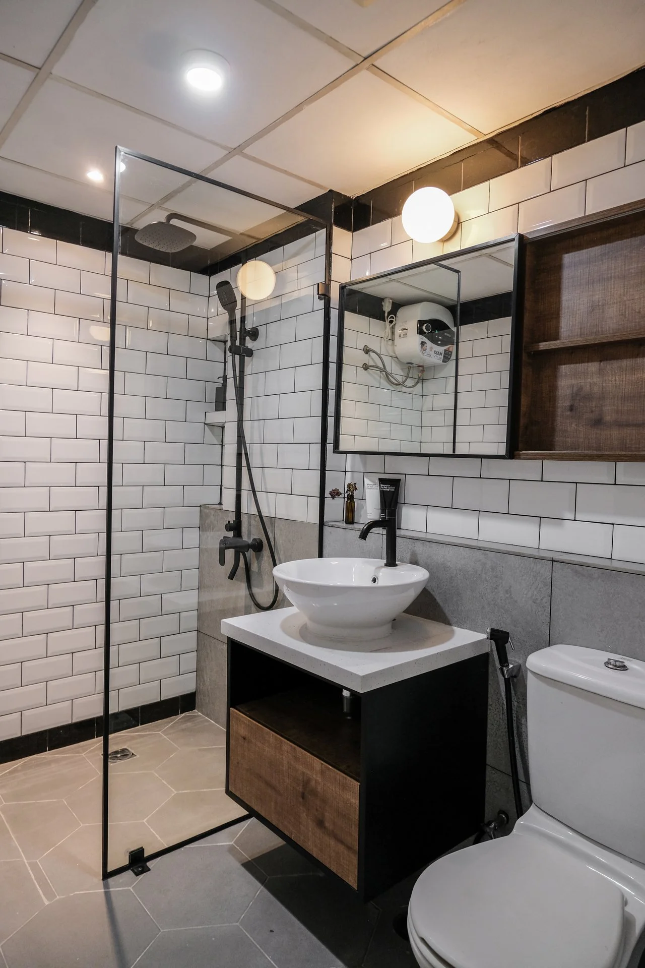 Existing drywall is removed to introduce natural light from the bedroom to the existing condition of the old apartment that is sandwiched from wall to wall, forming an open and lively space experience as you enter the unit, while still maintaining semi-privacy to the bedroom. New glass walls are developed in an arched shape to soften the new angular drywall that fits the living room by the windows, featuring a semi-rounded bar island that delineates the kitchen from the dining area.