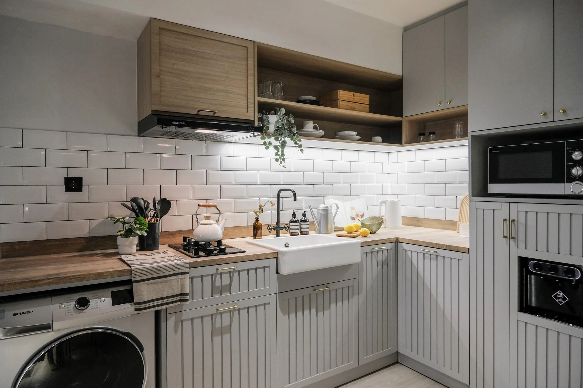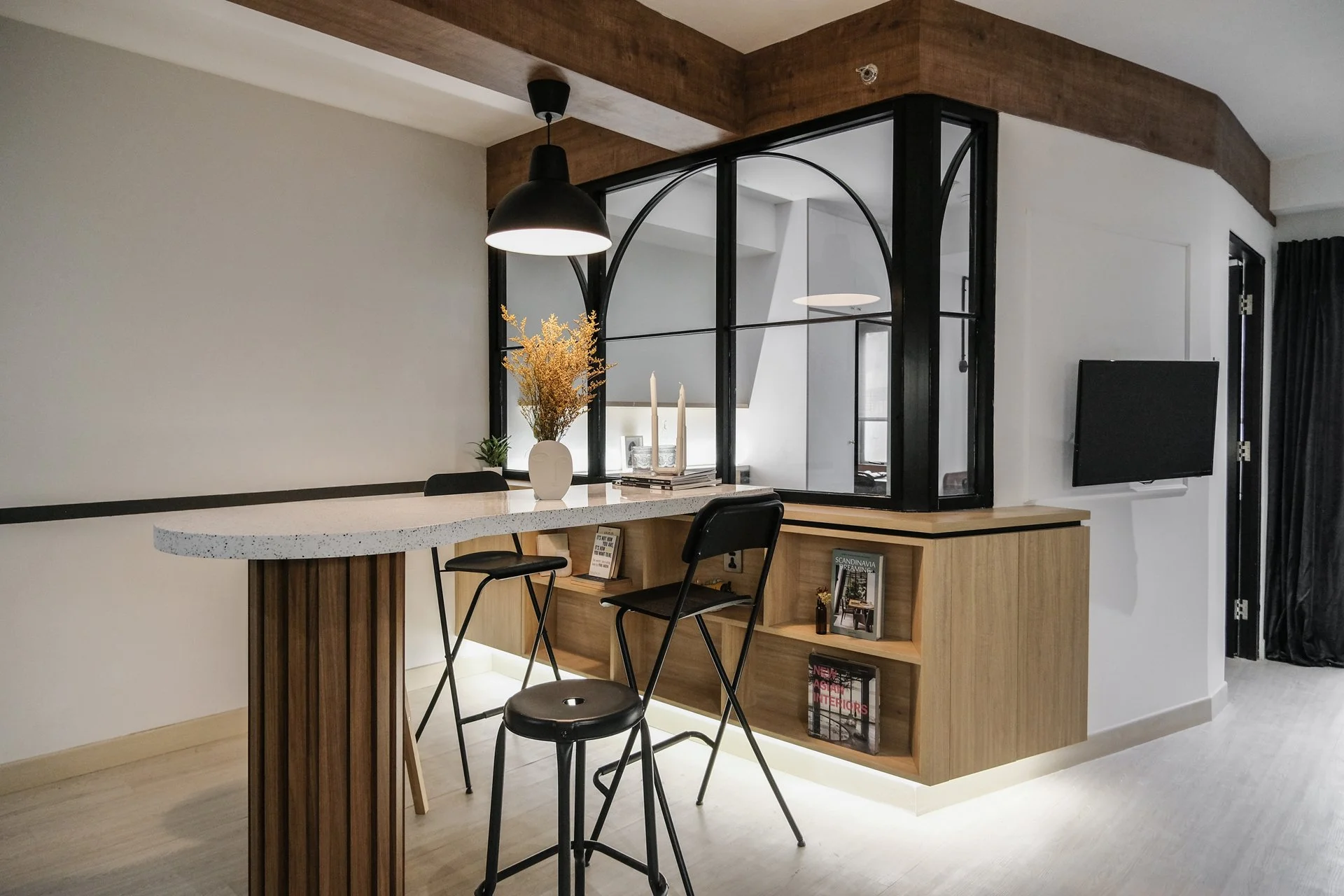 Upon entering the apartment, guests and the residents are visually pulled by the artificial wooden beam on the ceiling to integrate the design experience of the whole space. A barn door detail element is adding a hint of mystery and quirkiness in the foyer.